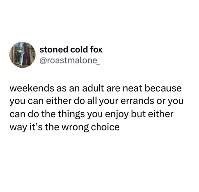 It says “weekends as an adult are neat because you can either do all your errands or you can do the things you enjoy but either way it’s the wrong choice.”